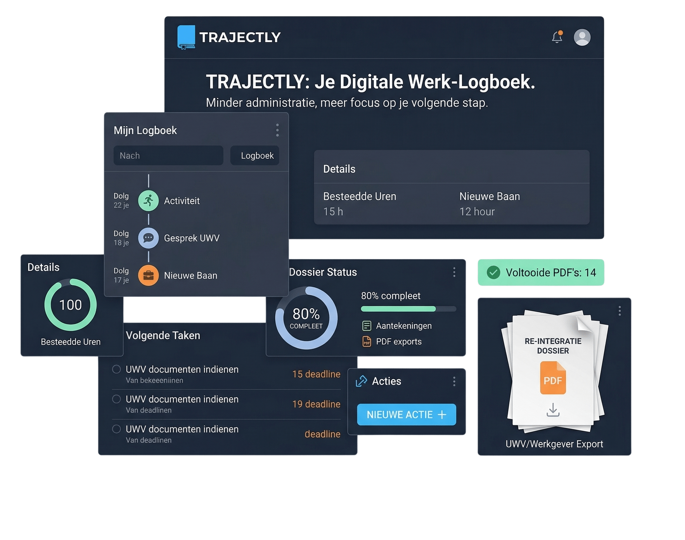 Nooit meer gedoe met losse aantekeningen voor het UWV. Leg je complete traject vast en exporteer alles in één klik naar pdf. Voor werknemer én werkgever